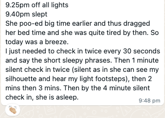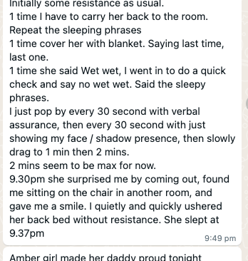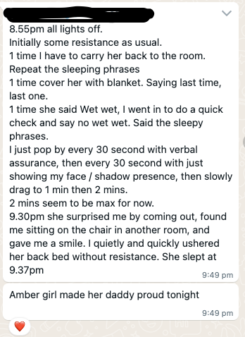 Parents’ doubt about the pop out and check in strategy. They were worried that she would come to the door to check on them instead and this might turn into a game for her. They didn’t want to feel like they’ve taken a step back. We discussed a few strategies such as placing a gate at her bedroom door. But honestly, I wasn’t feeling too good about this as it doesn’t feel respectful or you can’t trust the child because Amber is a really smart kid!